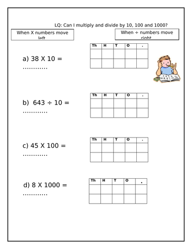 Dividing by 10 100 and 1000 worksheet tes. Live worksheets > english > math > multiplication and division > multiplying and dividing by 10 100 and 1000 multiplying and dividing by 10 100 and 1000 id: A short but very effective ppt that uses animation to show how digits are moved to the right/left in a place value chart when multiplying /dividing by 10 and 100.